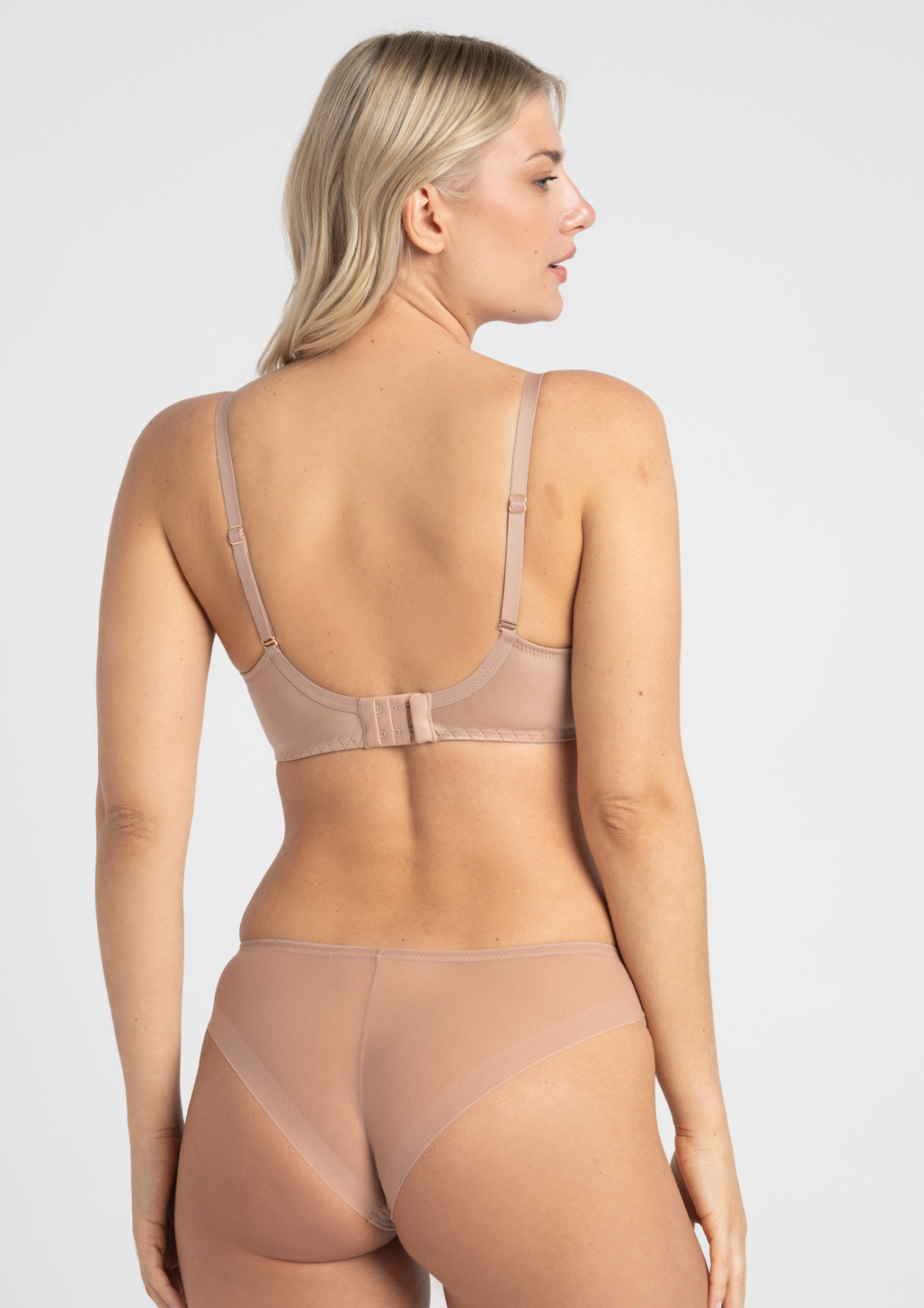 Na zapięcie biustonosza składają się dwurzędowe haftki w konfiguracji 2x3, tak byś mogła dobrać obwód w zależności od potrzeby. Trójstopniowe regulowanie obwodu to po prostu wygoda. W większych rozmiarach biustonosz zapinany jest na 3 haftki (3x3).